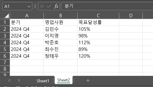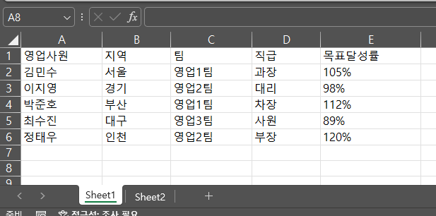 자신감이 붙어서 다음 문제를 물어봤습니다. Sheet1에 있는 영업사원 이름으로 Sheet2에 있는 그 사람의 목표달성률을 가져와야 했거든요.