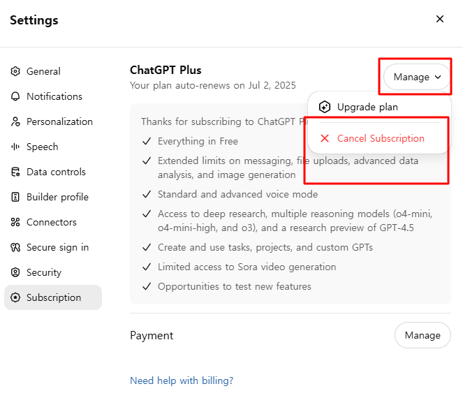 3. 'Manage' 선택한 후 cancel Subscription를 선택합니다